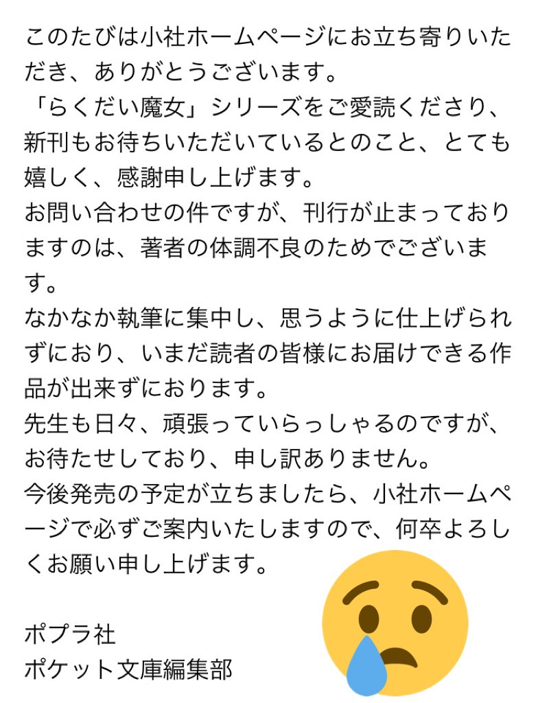 らくだ い 魔女 新刊-最新刊発売中! らくだい魔女と闇の宮殿 成田サトコ/作 杉浦 た美/絵 定価:本体650円(税別) フウカのママ、銀の城の女王が、仕事で行った古代遺跡で事故にあったみたい。らくだい魔女のホームページ 本の紹介 らくだい魔女と冥界のゆびわ ポプラポケット文庫 成田 サトコ 千野 えなが 本 通販 Amazon メルカリ らくだい魔女シリーズ 文学 小説 1 000 中古や未使用のフリマ 99以上 らくだ い 魔女 最 新刊 発売 日 ハイキュー